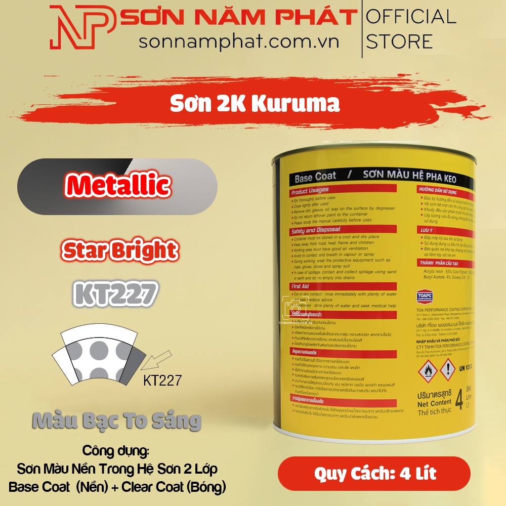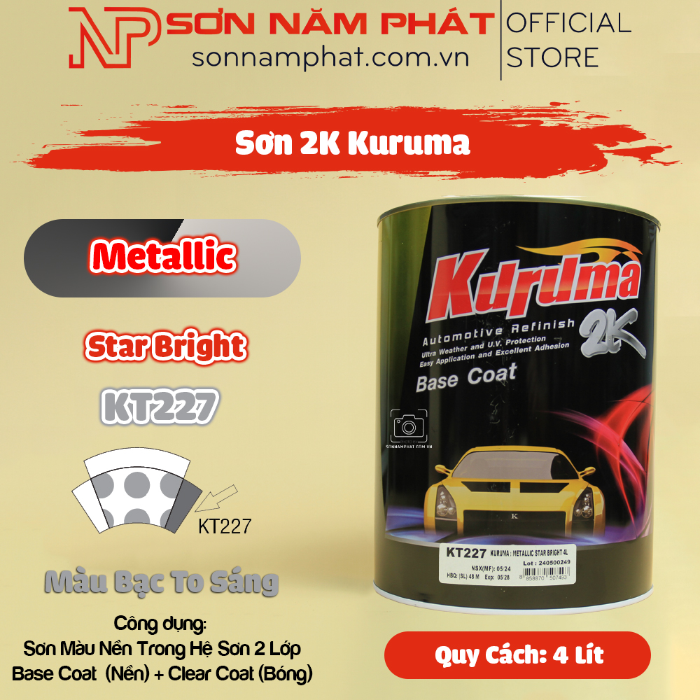 Sơn 2K Kuruma Star Bright KT227 là dòng sơn nhũ (Metallic) cao cấp, chuyên dùng làm lớp màu nền trong hệ sơn 2 lớp cho ô tô, xe máy. Với tông màu Bạc To Sáng nổi bật, sơn Kuruma KT227 mang đến vẻ ngoài sang trọng, hiện đại và đầy đẳng cấp cho các dòng xe.
