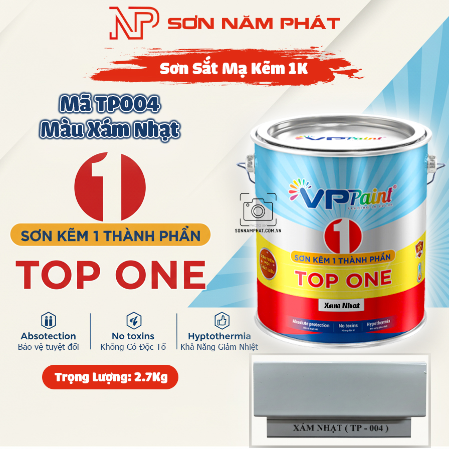 ⭐ Sơn Sắt Mạ Kẽm 1K TOP ONE Mã TP004 – Màu Xám Nhạt | 2,7Kg | VPPaint