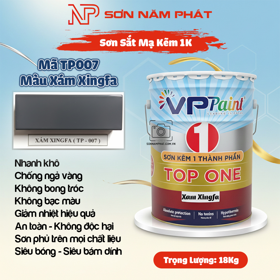 ⭐ Sơn Sắt Mạ Kẽm 1K TOP ONE Mã TP007 – Màu Xám Xingfa | 18Kg | VPPaint