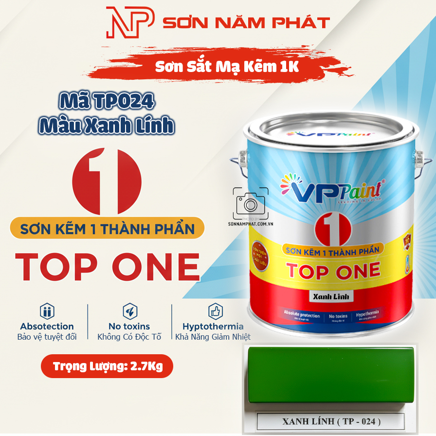 ⭐ Sơn Sắt Mạ Kẽm 1K TOP ONE Mã TP024 – Màu Xanh Lính | 2.7Kg | VPPaint