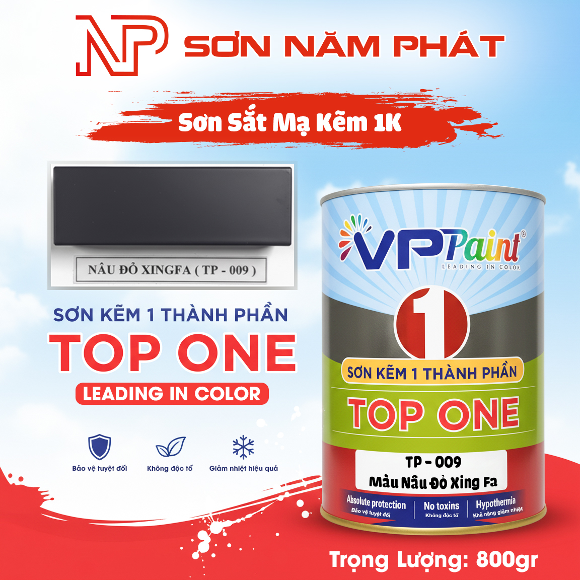 Sơn Tàu Thuyền 1K TP009 Màu Nâu Đỏ XingFa Viet Paint 800gr là dòng sơn sắt mạ kẽm 1 thành phần (1K) gốc Acrylic cao cấp, thuộc thương hiệu VPPaint – nhãn hiệu TOP ONE, chuyên dùng cho tàu thuyền, kim loại, nhôm hệ XingFa và kết cấu thép ngoài trời.