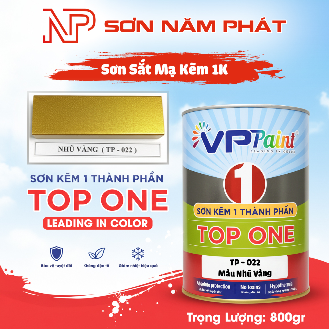 Sơn Tàu Thuyền 1K TP022 Nhũ Vàng Viet Paint 800gr là dòng sơn sắt mạ kẽm 1 thành phần (1K) gốc Acrylic cao cấp, thuộc thương hiệu VPPaint – nhãn hiệu TOP ONE, chuyên dùng cho tàu thuyền, sắt mạ kẽm và kim loại.
